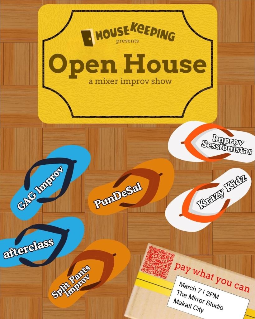 Open House: an improv show where Housekeeping Improv will perform along with 6 other improv groups: Split Pants Improv, Improv Sessionistas, afterclass, Krazy Kidz, Pundesal Improv and GAG Improv